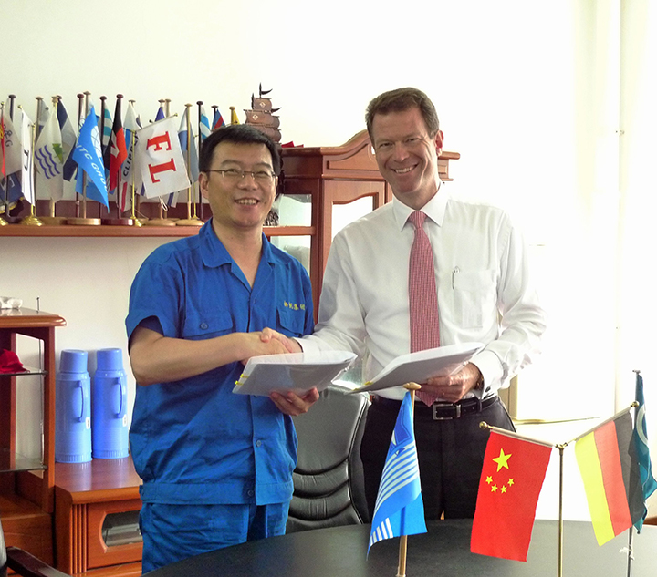 6月24日,集團公司與GL船級社就35900噸散貨船5號船和6號船簽訂了船檢檢驗合同,集團董事長李明東和GL亞太區總裁Mr.Lund分別代表雙方在合同上進行簽字。