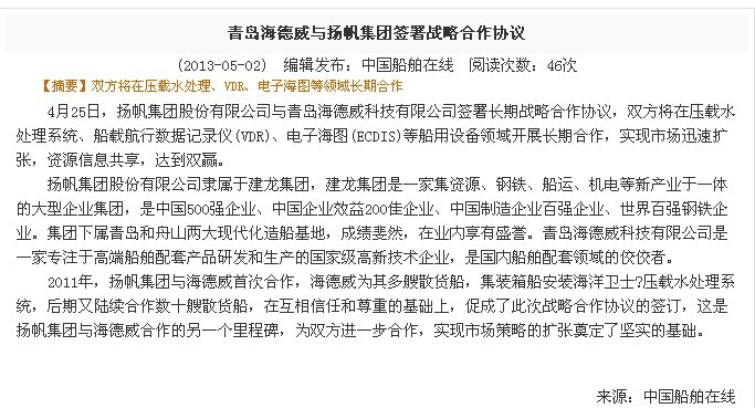 中國船舶在線:青島海德威與揚帆集團簽署戰略